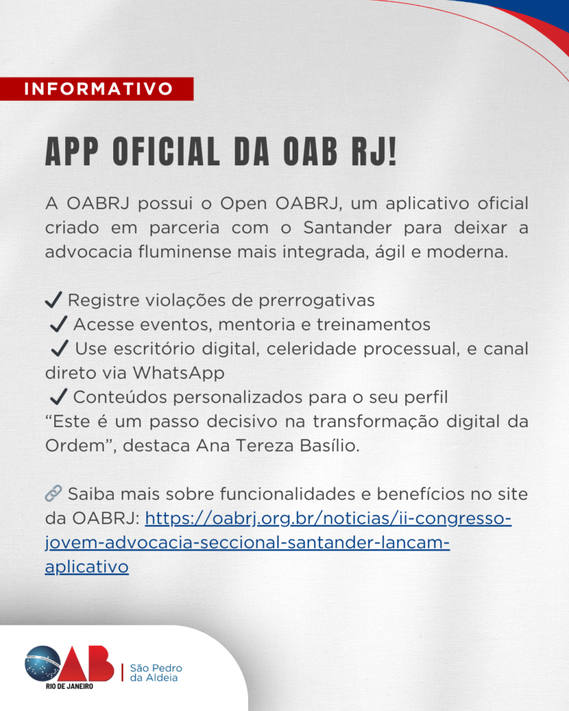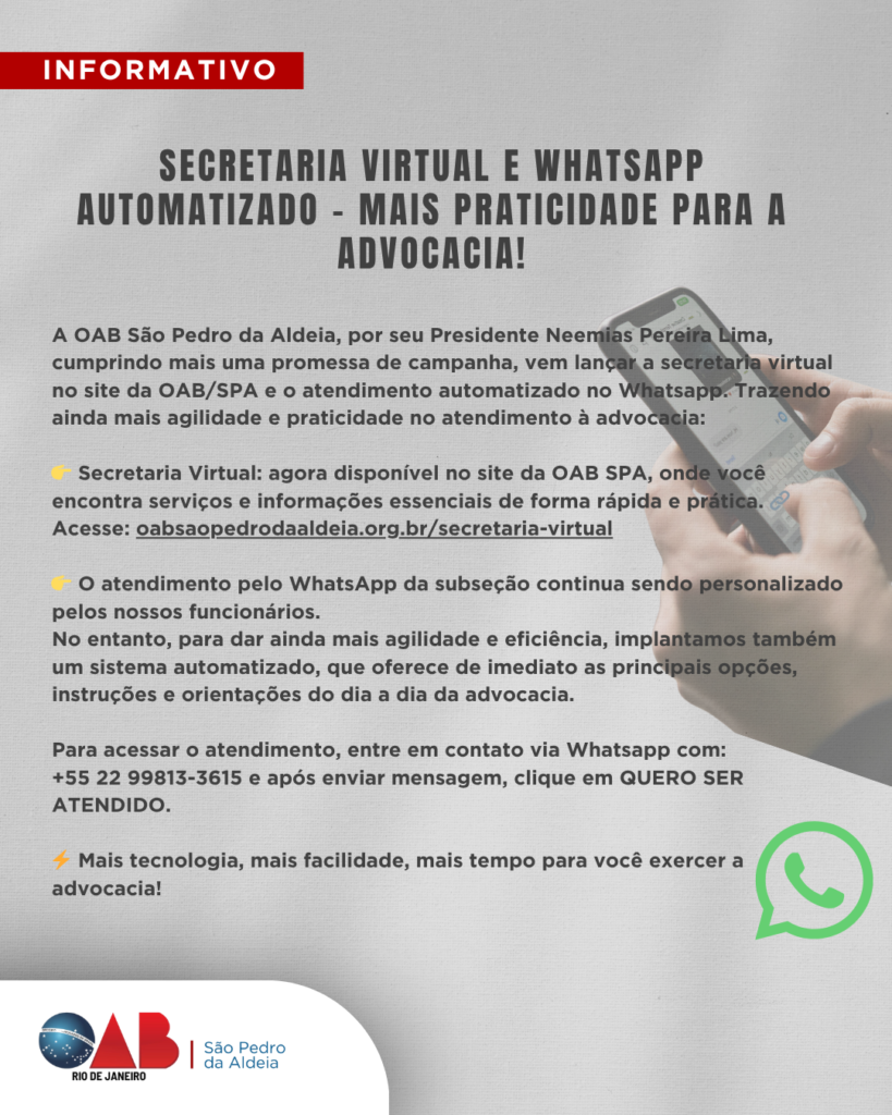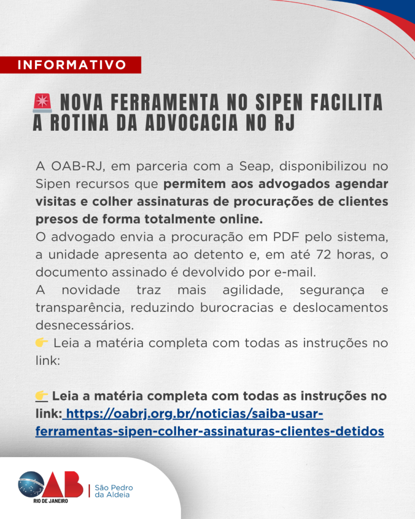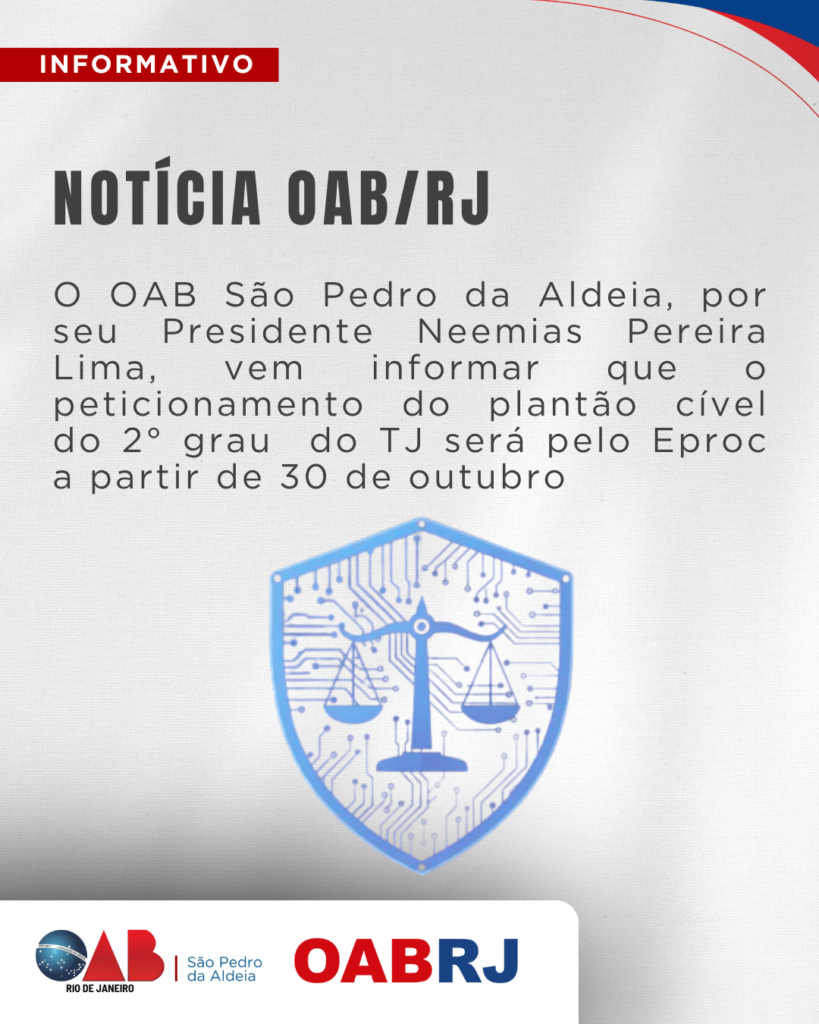 A OAB São Pedro da Aldeia, por seu Presidente Neemias Pereira Lima, vem informar que a partir do dia 30 de outubro, o peticionamento do Plantão Cível do 2º Grau do TJRJ passará a ser realizado exclusivamente pelo sistema Eproc. A mudança vale para processos que já tramitam no Eproc e para ações de competência […]