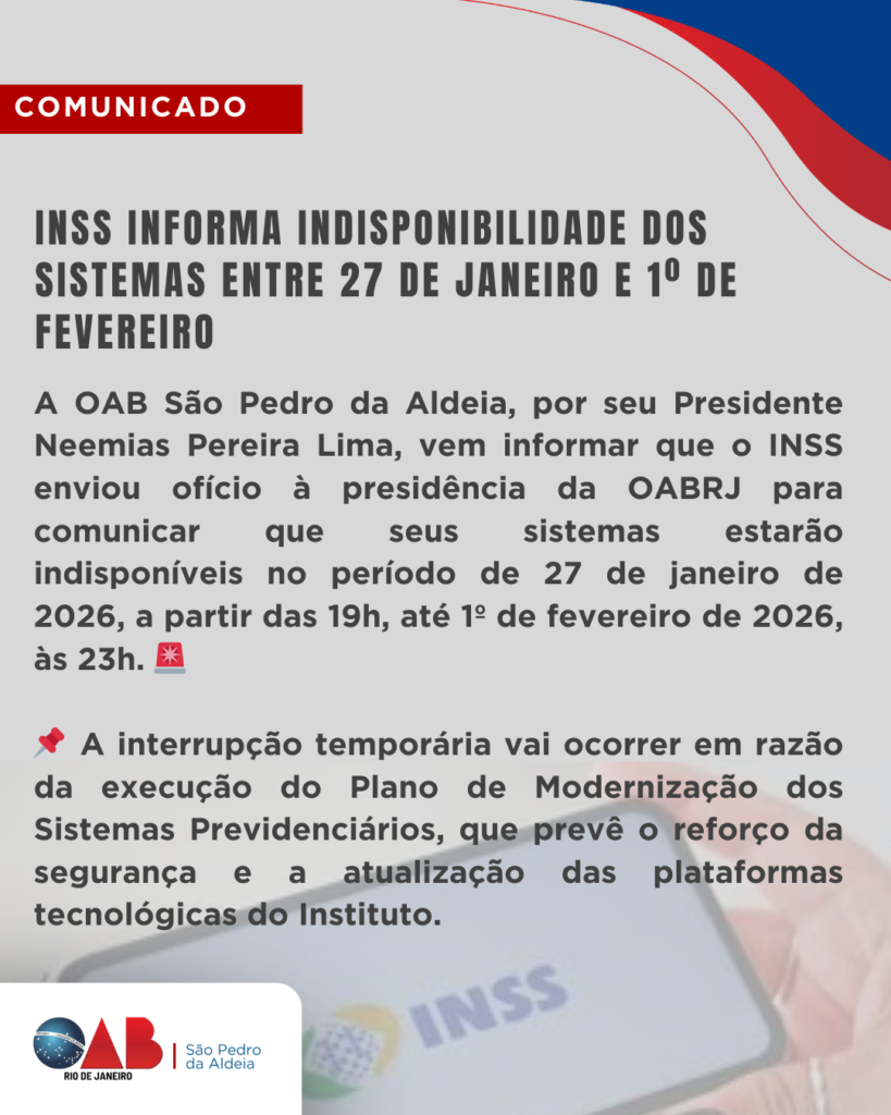 A OAB São Pedro da Aldeia, por seu Presidente Neemias Pereira Lima, vem informar que,...
