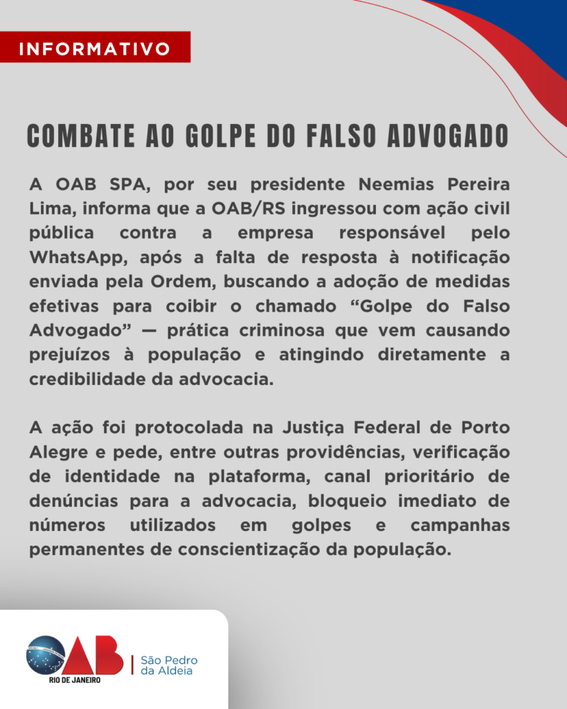 Continue lendoCombate ao golpe do falso advogado: OAB/RS ingressa com ação civil pública contra a administradora do WhatsApp